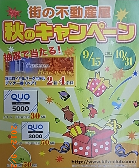 秋のの不動産キャンペーン始まりました。期間中の契約者の方に抽選でプレゼントがあります。クオカードやお米券、一等賞は横浜ロイヤルパークホテルディナー券です。