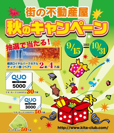 秋の不動産キャンペーン始まりました。期間中の契約者の方に抽選でプレゼントがあります。クオカードやお米券、一等賞は横浜ロイヤルパークホテルディナー券です。